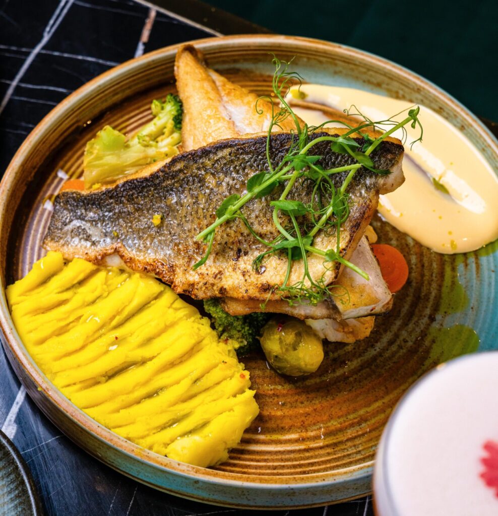 Pan seared salmon fillet served with caviar, basil puree, mixed vegetables and butter